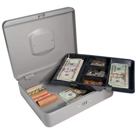 The six sectioned coin tray is capable of storing pennies, dimes, quarters, halves and dollars, whereas the three sectioned lower tray can easily hold receipts, documents and currency bills. The change tray can be conveniently lifted with the help of a lid, which makes accessing the contents of the box very easy.