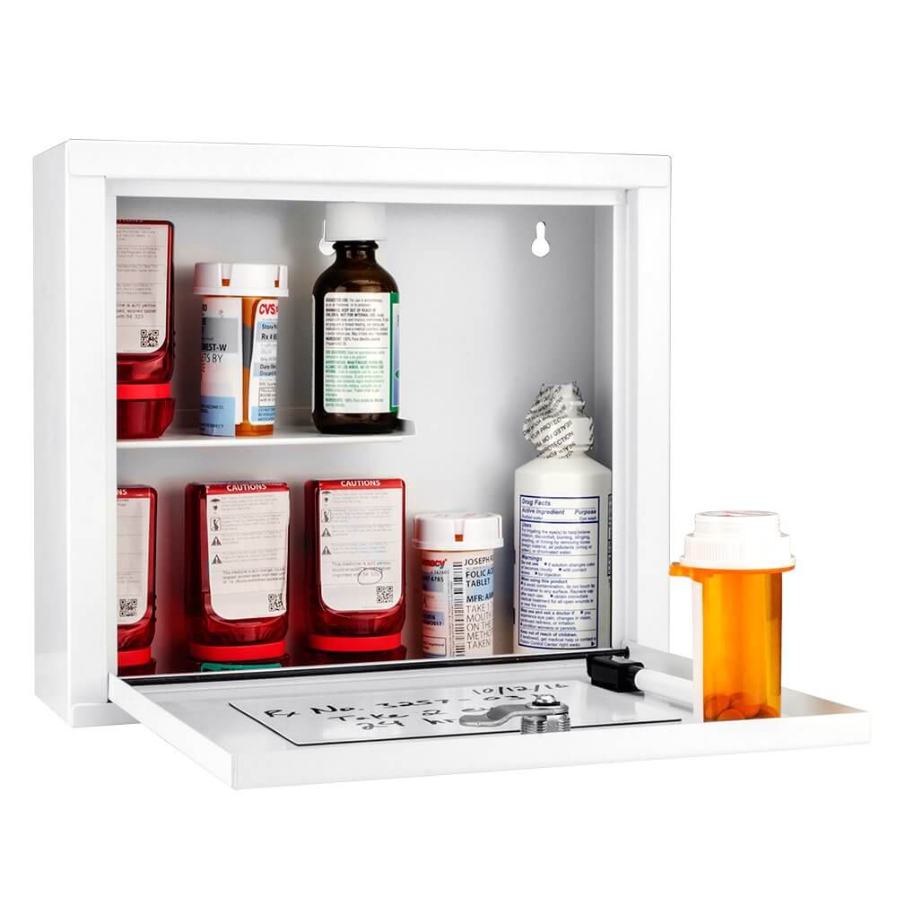The Small Medical Cabinet by Barska keeps prescription medication and other medical supplies safely stored and secured. The front opening door doubles as a convenient tray for temporarily holding medication, and an internal shelf helps maximize storage space. Notes about prescriptions or patient information can be left on the included magnetic dry erase pad, and a magnetized dry erase marker can be placed anywhere on the Small Medical Cabinet to ensure that it is always within reach. The