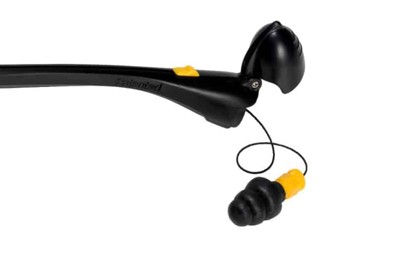 Ballistic rated shooting glasses with built-in retractable and replaceable silicone earplugs (NRR 25dB).