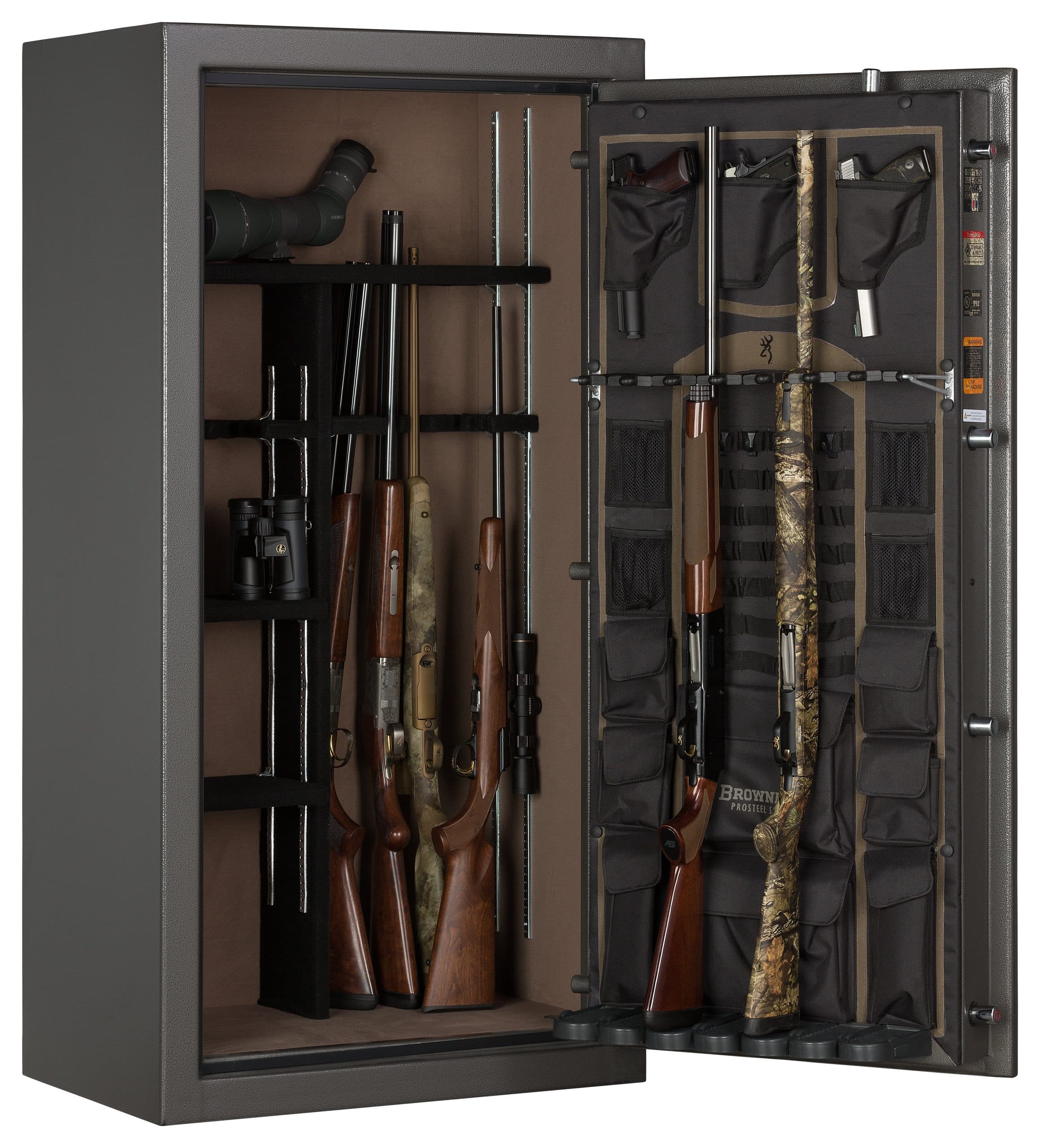 It also offers side shelves that allow you to have ear protection, binoculars, and other accessories right where you need them. Accessory storage can also be changed to extra handgun storage if you ever feel the need. The standard DPX Storage System Competitor modular storage option is top-notch. Browning believes modular storage options are important enough to be included as a standard feature with every safe they offer. This means you can easily store more in the same space, so if your gun collection size changes, you can easily change your storage space. This model is available in two colors, Hammer Gloss Gray or Putty Gray finishes.