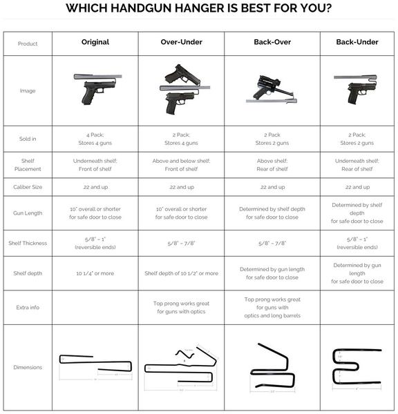 To help you decide which Handgun Hanger will work best for you view our Comparison Chart in the picture above. If you’re still not sure, we offer a Variety Pack where you will receive one of each Handgun Hanger style.