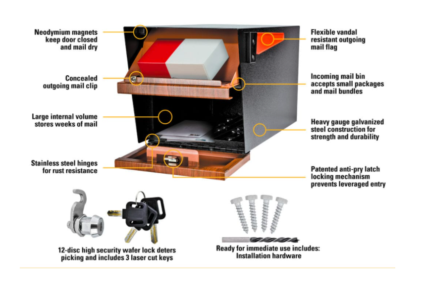 - Innovative baffle door design accepts mail bundles and small packages but protects against fishing and mail theft