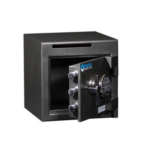 The B1414SE is a drop deposit safe designed by Protex. A drop slot on the outside holds envelopes and other small objects. To prevent envelopes and other small things from being fished back out of the safe, a front loading anti-fishing baffle is standard.