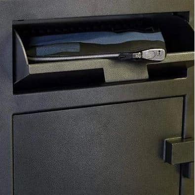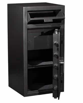 Protex B-rated depository drop safes are ideal for convenience stores, hotels/motels, churches, gas stations/car washes, restaurants, and other locations. The safe has a laser-cut 1/2-inch steel plate door, a spring-loaded re-locker, chrome-plated heavy-duty steel locking bolts, and an anti-drill lock plate. The door has a brushed chrome plated handle as well as vault type hinges with an internal dead-bar to prevent the door from being removed while the safe is locked. Anchoring the safe to a concrete floor is made possible by mounting holes and anchoring gear.