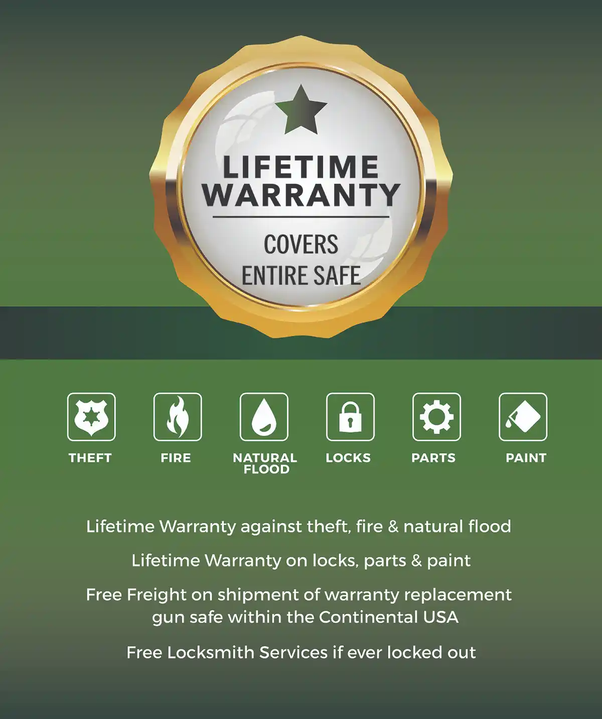 We stand behind our products with a Best-in-Class Lifetime Warranty, which covers the entire safe against theft, fire, natural flood, locks, parts, and paint. We offer free freight on warranty replacement gun safes in the continental USA as well as free locksmith services if you ever get locked out.