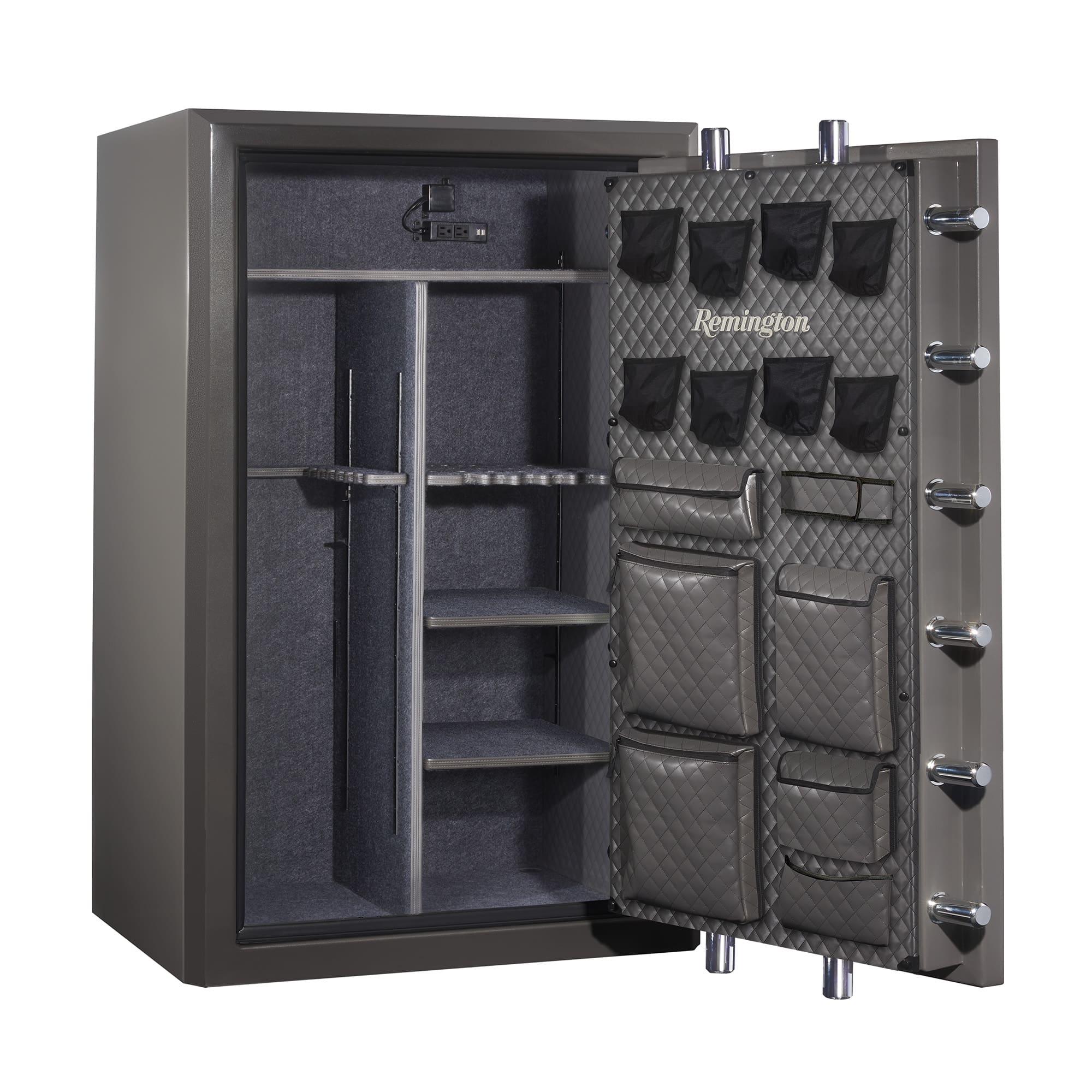 The Remington Nitro SAR6536N gun safe provides top-level security for your firearms and valuables. It is fire-rated for 90 minutes at 1800 degrees and waterproof for up to 7-days in 2 feet of water. The SecuRam™ digital lock is backlit for easy access in low light. The body is forged from 11-gauge steel, weighs 930 lbs., and is painted a glossy Seltzer Gray Metallic. Entry to the safe is intuitive with the 5-spoke chrome handle with carbon fiber accents. The fully lit interior features quilted vinyl on the sidewalls and door. There is plenty of storage for guns and hunting accessories on the door storage and adjustable shelving. Stay powered up with dual outlets and two USB ports. The sophisticated design of the Remington Nitro safe is both practical and inspiring.