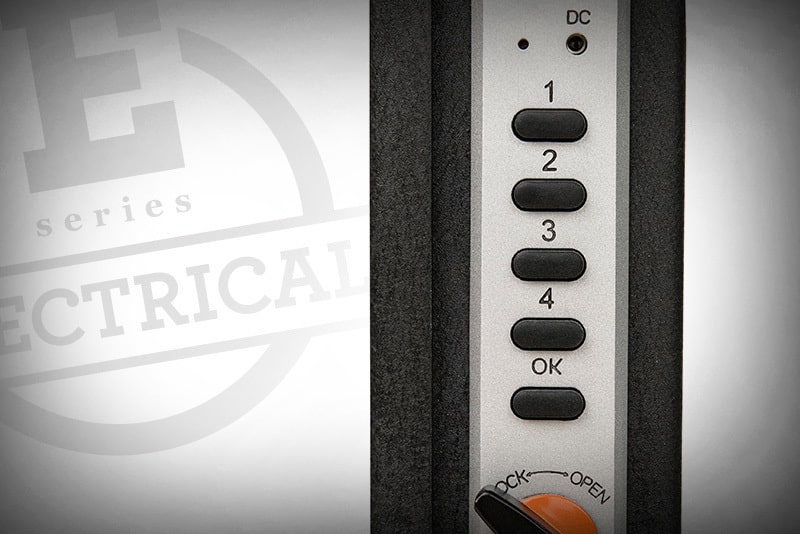 The 200E Series lock is a unique 5 button, electronic programmable lock. It provides over 1.2 million combinations, and includes a battery backup kit, and a key override.