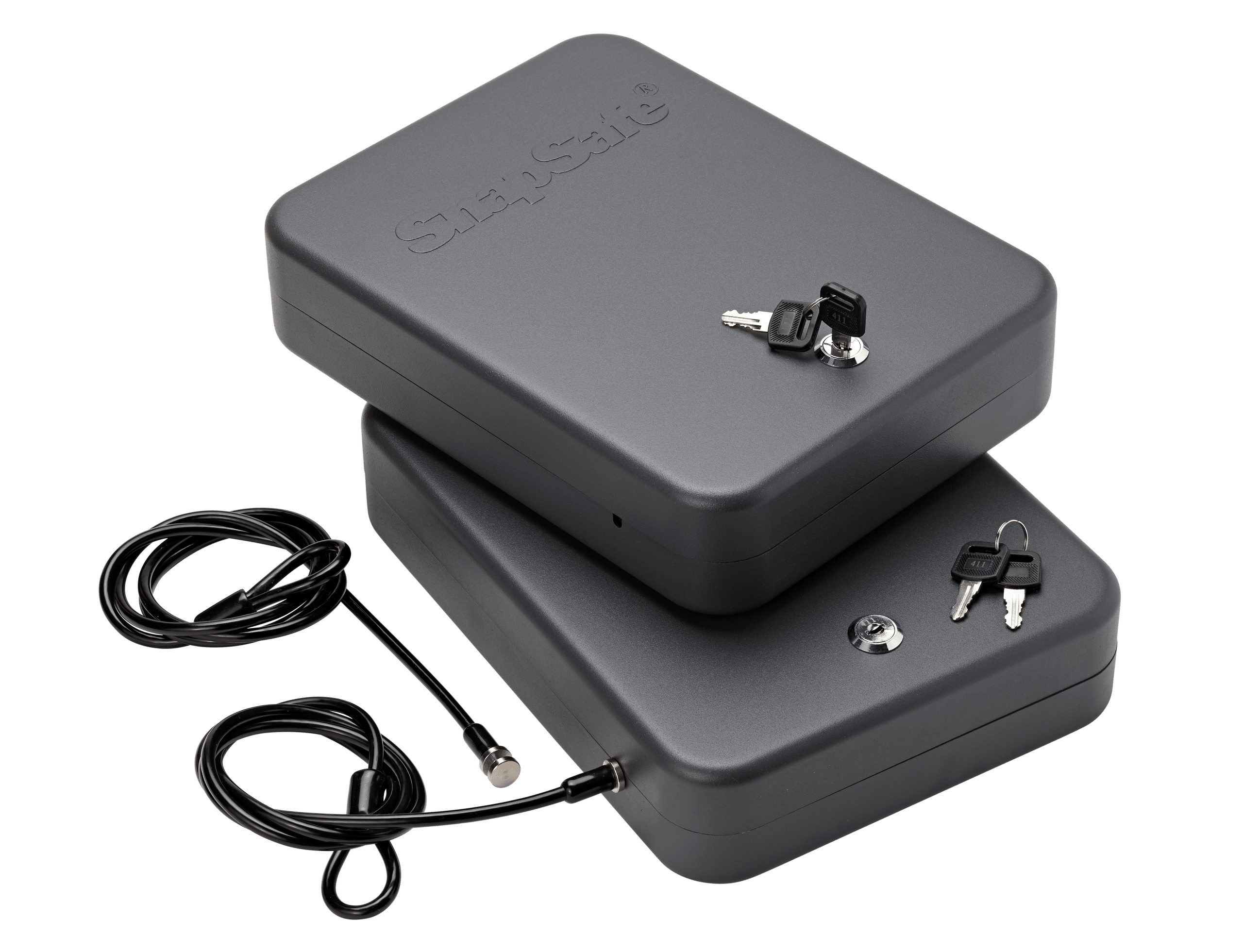The SnapSafe Lock Box provides secure storage for handguns and other valuables at home, on a nightstand, in the car or when traveling. The included heavy steel cable secures the Lock Box to any stationary object, car seat or the internal frame of a piece of luggage. The Lock Box also provides security for Conceal Carry Permit holders. The SnapSafe Lock Box 2-Pack Keyed Alike come with four keys (all unlock both lock boxes), two 1500lb rated cables and 2 lock boxes. The thick steel construction and high quality foam will ensure that you firearms and valuables travel securely anywhere.