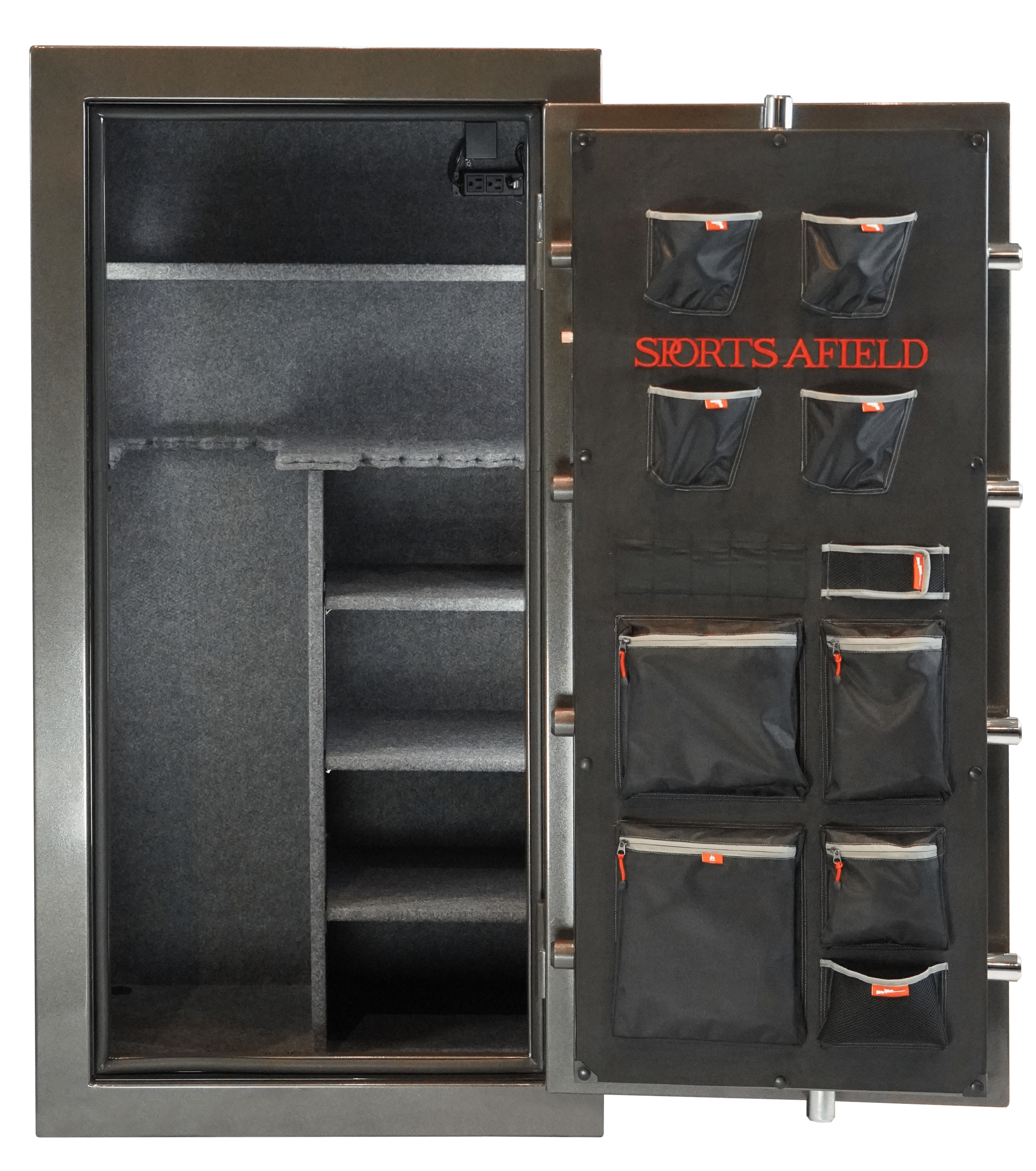 Venturing further into any wildlife habitat will eventually lead to areas that are seemingly impenetrable. It is in these places that only the most cunning of creatures such as the mountain lion and birds of prey can call home. With a watchful eye looking over your most prized possessions, the Haven series of safes, enhanced with fire and water protection and ultimate organization, brings you that much closer to total protection. Go away for a weekend and come back to a flooded basement or even worse get a frantic call from your neighbor letting you know your house is on fire. Rest easy knowing that a watchful eye is looking over your possessions. This safe not only sports increased steel thickness and bolt count, but fire protection for 75 minutes at a blistering 1400°F. All the while, our proprietary Triple Seal maintains a waterproof seal keeping your valuables dry for a full 7 days at a water height of 2 ft. A UL rated power outlet allows the use of your favorite anti-humidity device to be used. Your guns and accessories will never be more organized or accessible with the half U-shaped, half rack- style adjustable gun rests and deluxe style door organizer.