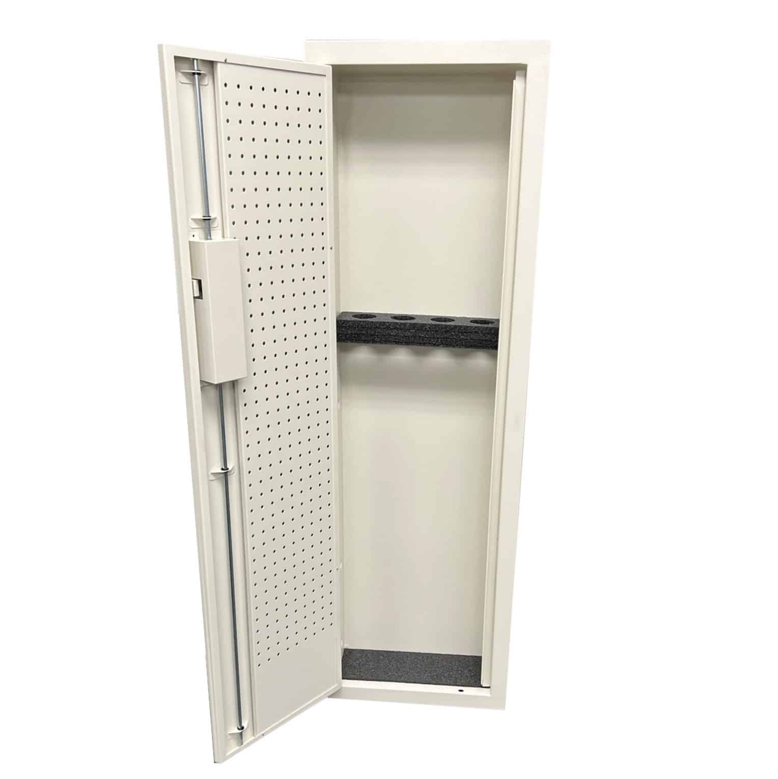 V-Line’s new Closet Vault Plus has been refitted with the all steel Peg Board as a standard item. The Closet Vault Plus has the new 3 Point locking system. The Peg Board adds additional strength to the door and allows for more options when configuring the in wall vault vs. the original Closet Vaults. The unique in-the-wall safe that fits between the wall studs (16” on center 2×4). The Closet Vault PLUS provides a unique and space conscious way to secure firearms and valuables such as laptops, jewelry, and other items with the convenience of quick access. The door and frame protrude less than 2 inches from the wall, allowing it to be concealed behind a door or in a closet. The Closet Vault Plus with the installed Peg Board comes standard with the adjustable black foam barrel guard.