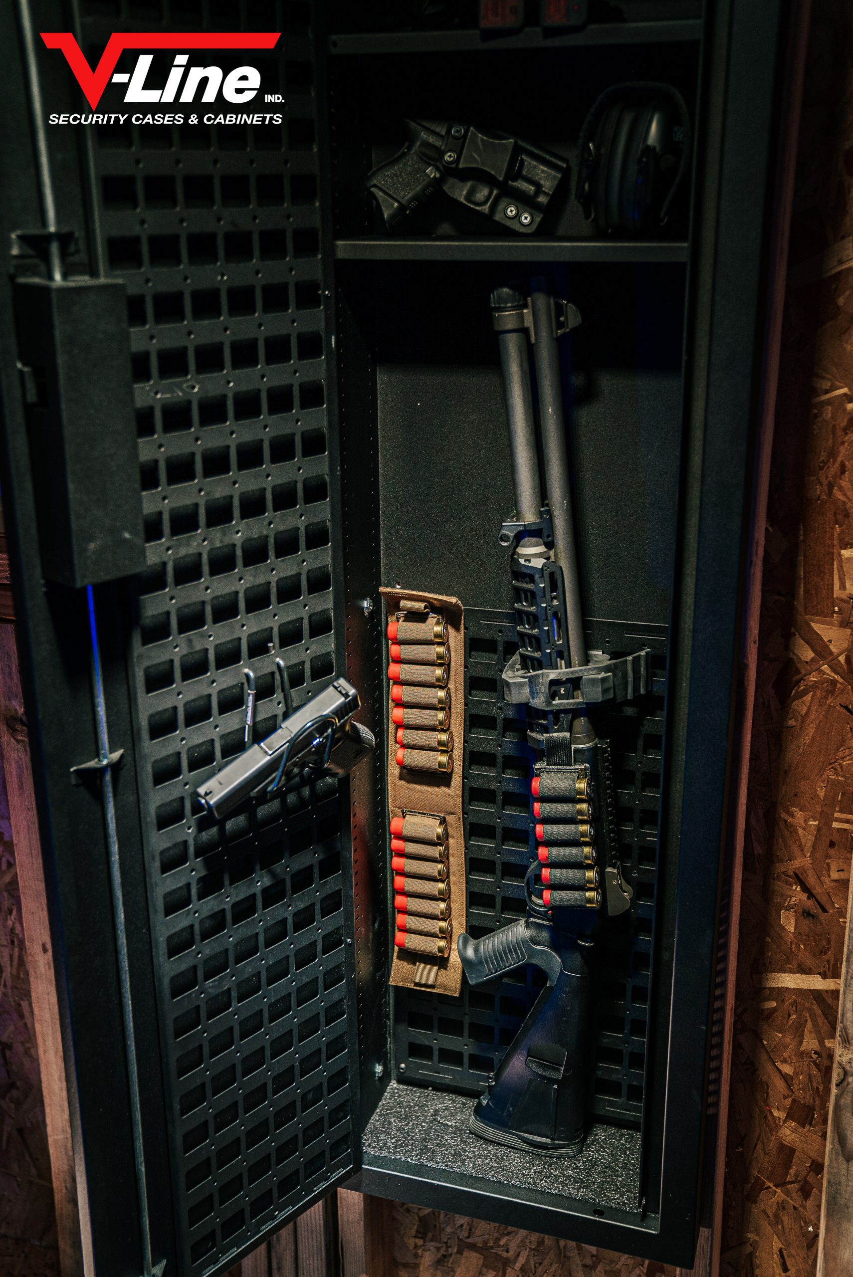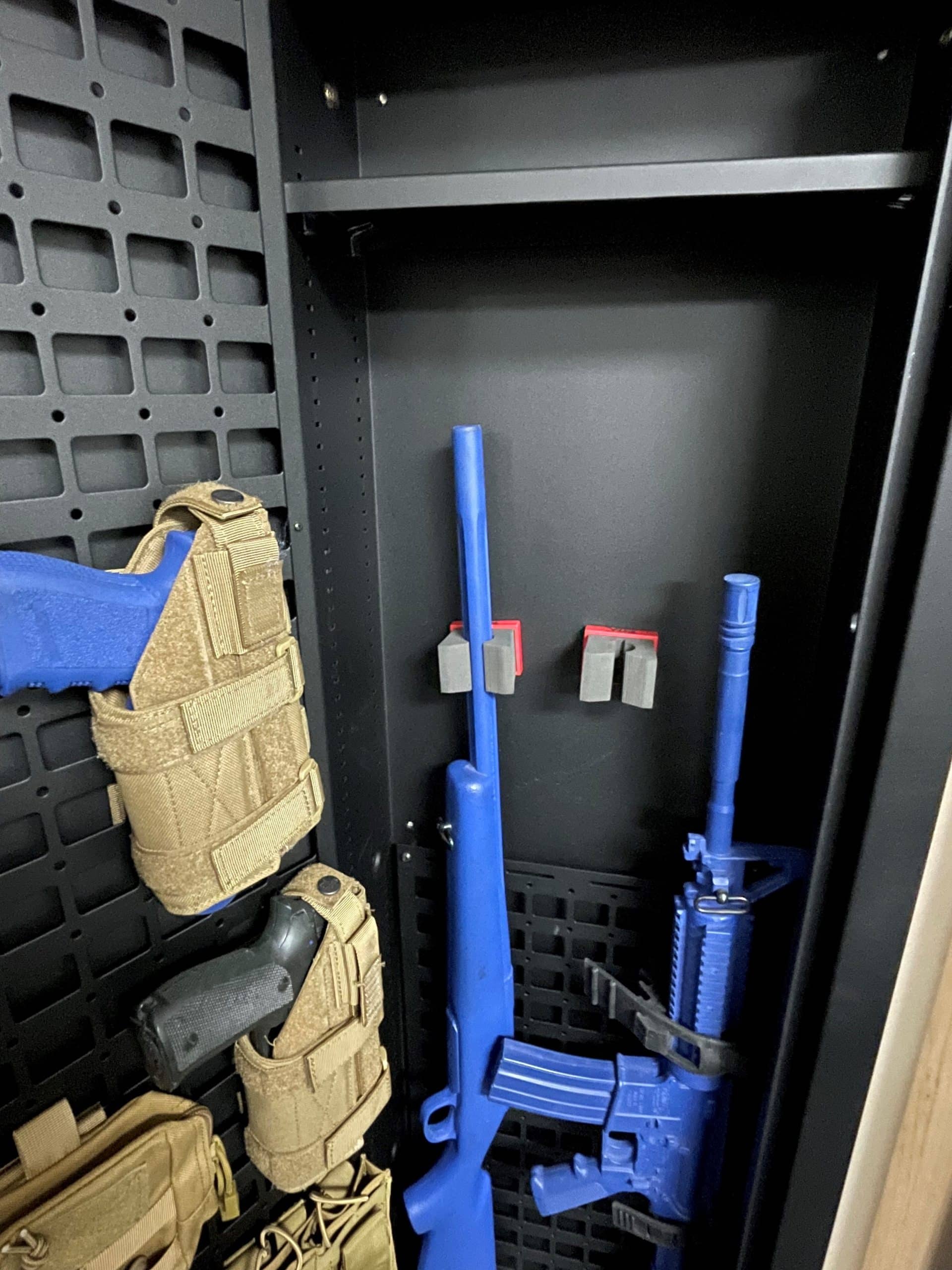 - The Tactical Closet Vault ships standard with an installed Molle Door Panel and 2 Magnetic adjustable barrel guards.