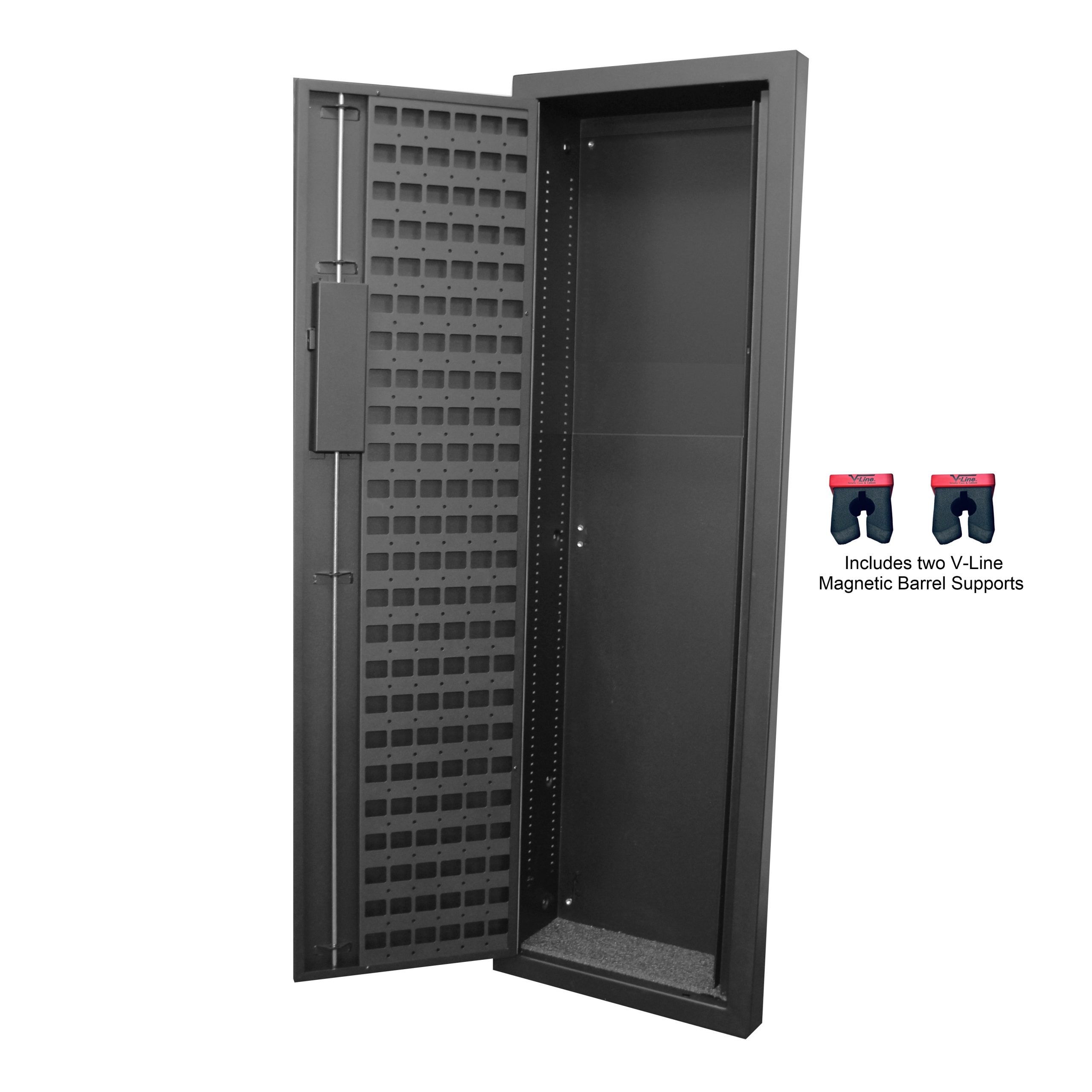 “V-Line’s” NEW in-wall Tactical Closet Vault is finished in a rugged Flat Black powder coating and is outfitted with an all steel Molle Board on the door. The Tactical Closet Vault has been specifically designed to conveniently store and organize tactical gear. The three point locking system with the Simplex quick access push button lock provides superior security on the corners of the door. The lock does not require batteries and will always be at the ready. The Tactical Closet Vault in-the-wall safe fits between the wall studs (16” on center 2×4). The Tactical Closet Vault provides a unique and space conscious way to secure firearms and your tactical gear such as magazine clips, ammo pouches, flash lights and optional mounts for your home defense weapons and other items with the convenience of quick access. The door and frame protrude less than 2 inches from the wall, allowing it to be concealed behind a door or in a closet. The Tactical Closet Vault comes standard with the door side Molle Board and an 2 adjustable magnetic barrel guards. The Tactical Closet Vault has a variety of tactical gear organizer options that will help keep your gear secure, readily available and well organized. Eight Optional Kits include additional Molle Boards for the back panel, Fixed and Adjustable Long Gun Mounts and adjustable Full Shelves.